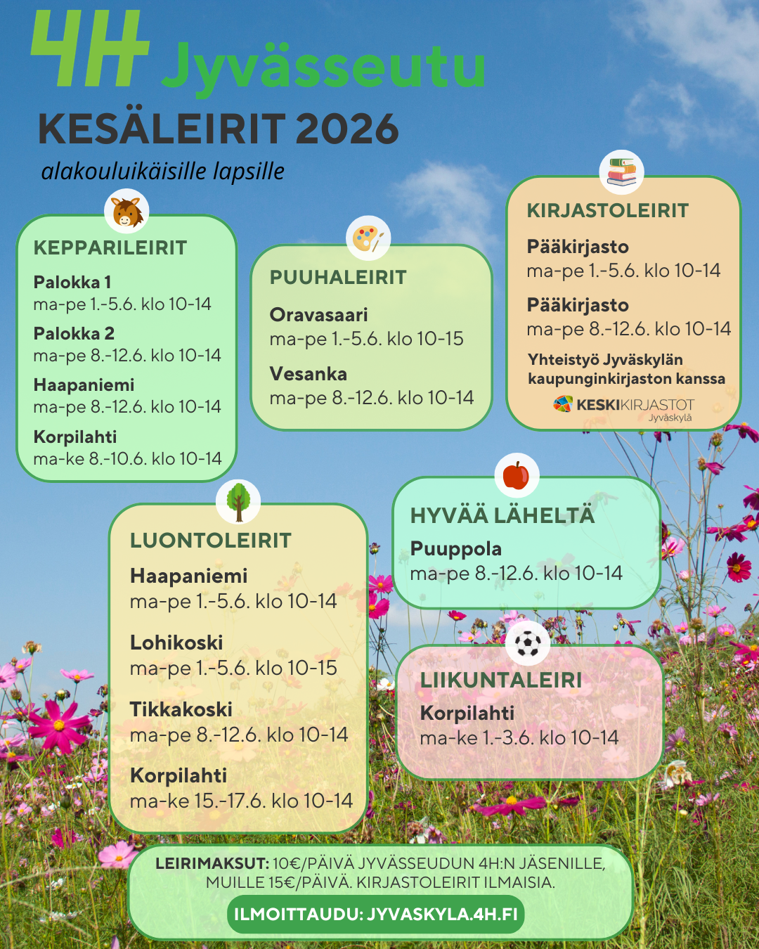 Järjestämme leiritoimintaa koulujen loma-aikoina. Teemat ja sijainnit vaihtelevat. Toiveet ja ideat voi laittaa meilitse anna.moilanen@4h.fi. Leirimaksuissa alennuksia jäsenille.
