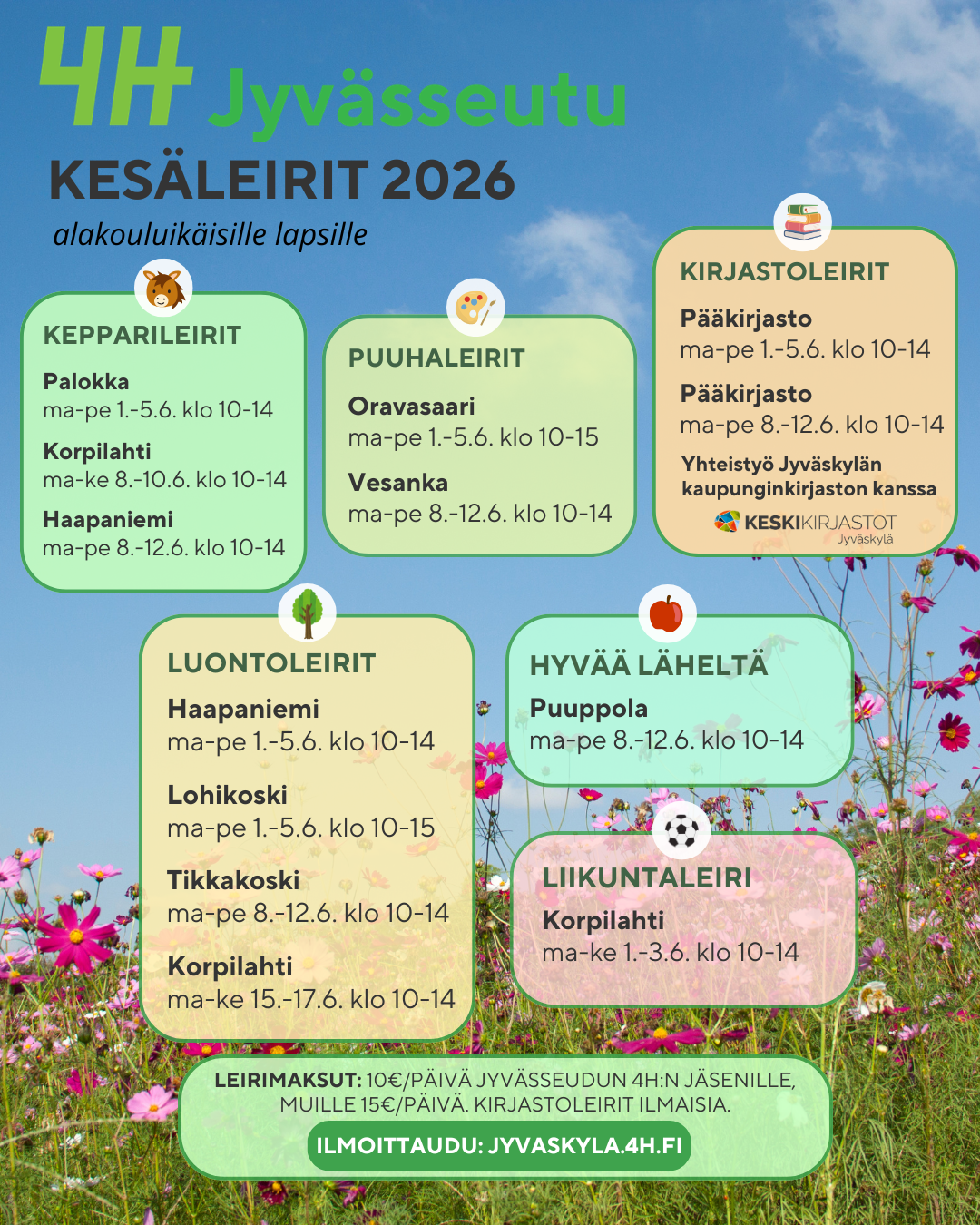 4H järjestää koulujen loma-aikoina päiväleirejä Jyvässeudun alueella.